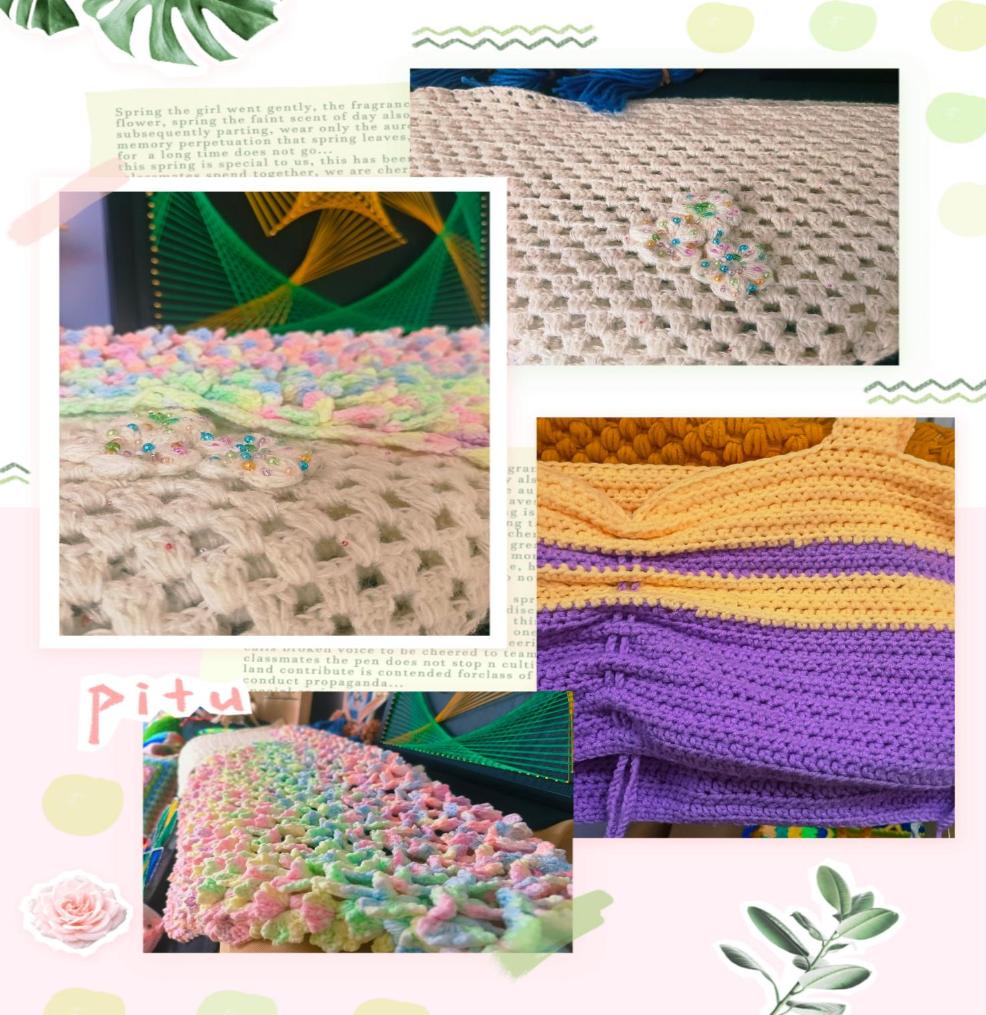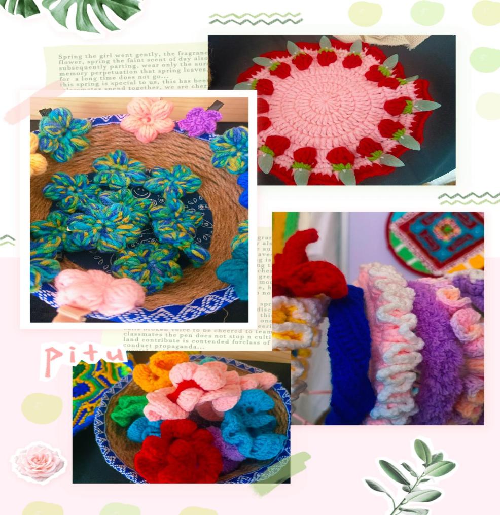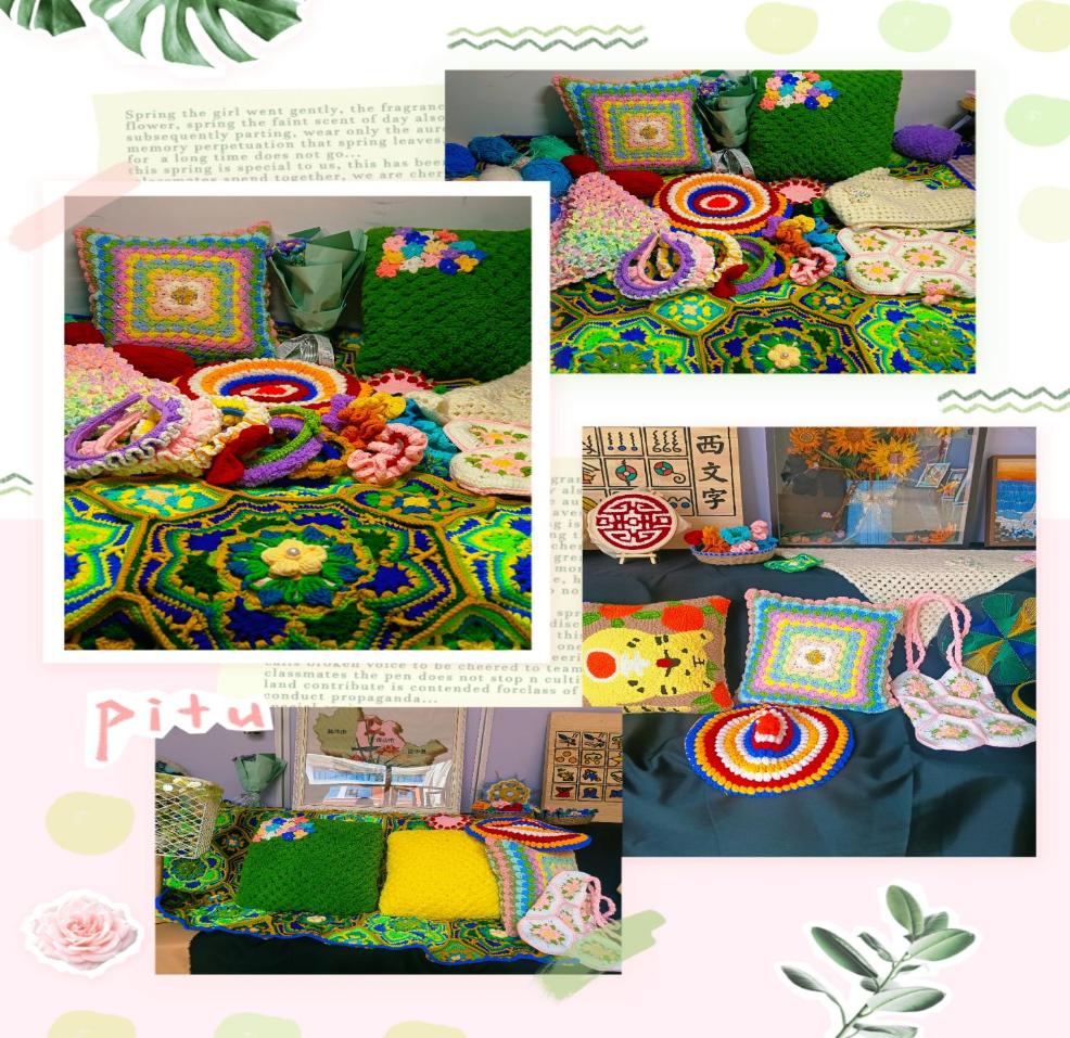 《织韵》运用钩针编织了毯子、抱枕、坐垫、茶杯垫、穿戴品和小饰品等。毯子的配色灵感主要来源于中国古代著名画家王希孟的《千里江山图》,以波斯瓦六边形、四边形、三角形拼花拼成整块,毯子中间用泡芙花做点缀,寓意着坚韧和坚强,以青绿色为底色象征着生命与希望;抱枕和披肩运用马卡龙色系,给人一种优雅纯净的感觉,仿佛让人游走在梦与现实的边境,给视觉空间增加了色彩感和灵动性,同时,在钩针织物上运用珠子点缀使得织物更具立体感。