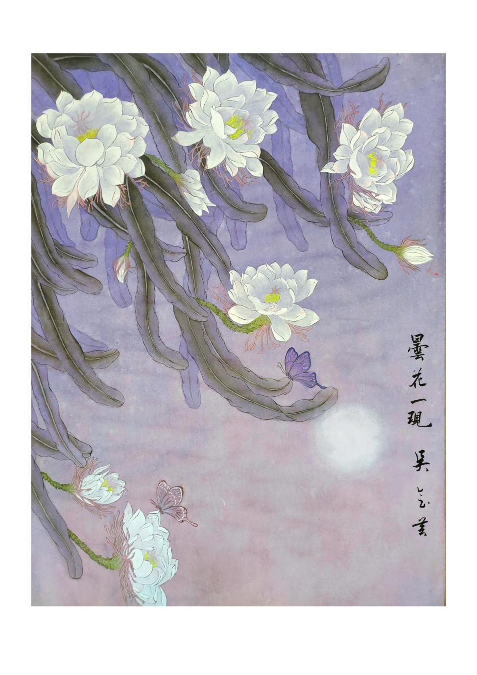 《昙花一现》作品属于花鸟国画,采用中国画的技法,把工笔画和现代色彩相结合,呈现出唯美的画面效果。整体画面以蓝紫色背景为主,上下两部分的颜色鲜明,左下部分分布两朵昙花,画面中分布着两只蝴蝶,一轮圆月,整体呈现出唯美的花鸟国画面貌。昙花象征着刹那的美丽,一瞬间即永恒,转瞬即逝,人们通常用它来代表短暂但又美好的事物,昙花开花极为少见并十分令人惊艳,昙花一现,永恒芳华,这些来之不易的刹那芳华在释放之后更定格为永恒,而这些蓄足力量的释放正是基于那持久的也是异常艰苦的积累,昙花只会在夜晚的时候绽放,象征着漂亮的女士和有梦想的人,也在警示人们要抓住机遇。而选择昙花作为题材,是因为昙花一生只开一次花,其积攒了一生的心血,只为了夜里的一次惊艳绽放,因此昙花还有“执着追求”的寓意,它就好像那些执着追求梦想的人,虽然会消耗一生的精力与心血,但为了梦想无怨无悔。