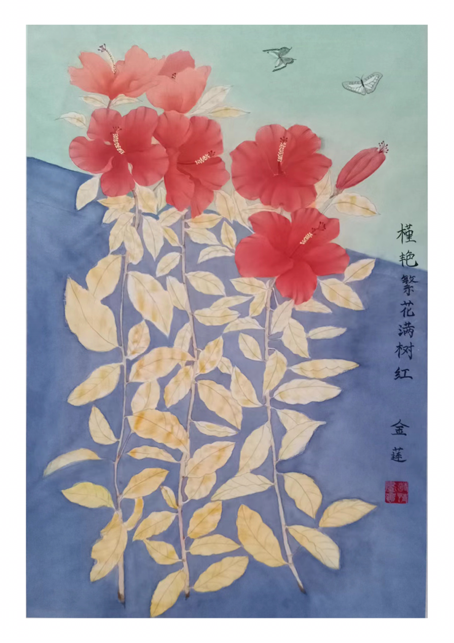 本作品将工笔画的罩染、分染与没骨画画中的撞水相结合,蓝绿相拼接的背景色使红色的花更加娇艳欲滴,黄色的叶子与红色的花儿搭配极具视觉冲击力,妙不可言。朱槿花日出盛开日落闭合,时刻保护花蕊,提醒人们要懂得珍惜和保护爱自己和自己爱的人;醒目的红色热烈外表下,更是有一股积极向上的精神,人们看到就充满活力,精神焕发;盛开的花朵与翩翩起舞的蝴蝶,表达出你若盛开,蝴蝶自来的思想,鼓舞人们无论身出何时何地都要努力积极向上,将来等你成熟稳重,足够优秀了,会有很多机会像蝴蝶一样向你扑面而来。花是其容貌之体现,叶是其养份之来源,枝干是其生命之支撑,整副画面采用了竖构图,使画面紧密的联系在一起。将花的特点形态表现出来,使人感受生命之美。