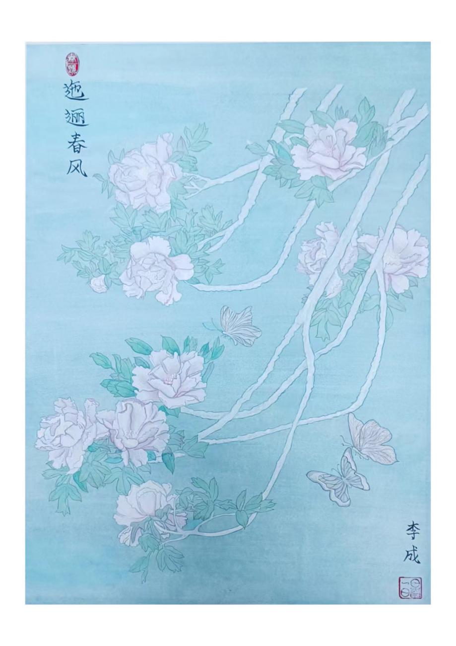 工笔牡丹千百年来被我国的画家们所喜爱,人们常用工笔牡丹来表达“国色天香”的意境,一提起牡丹我们总能和雍容华贵的杨贵妃联系在一起。工笔牡丹的颜色、姿态、韵味儿甚至从画卷中流露出来的香味儿都美得极其有特点,也因此工笔牡丹被人们寓为美满幸福、富贵繁荣等吉祥的象征,我创作《迤逦春风》时绘画趋向简洁、素朴、空灵之美,画面清雅虚淡,采用纵向构图,画面重点集中左下,凸显牡丹生机勃勃,表达了牡丹在大自然的庇护下怡然自得,与世无争,相与和谐,是一种难得的生命境界,也是我对自己以后在未来社会的理想状态的向往,希望自己犹如这幅牡丹一样淡雅从容,坚持自我。