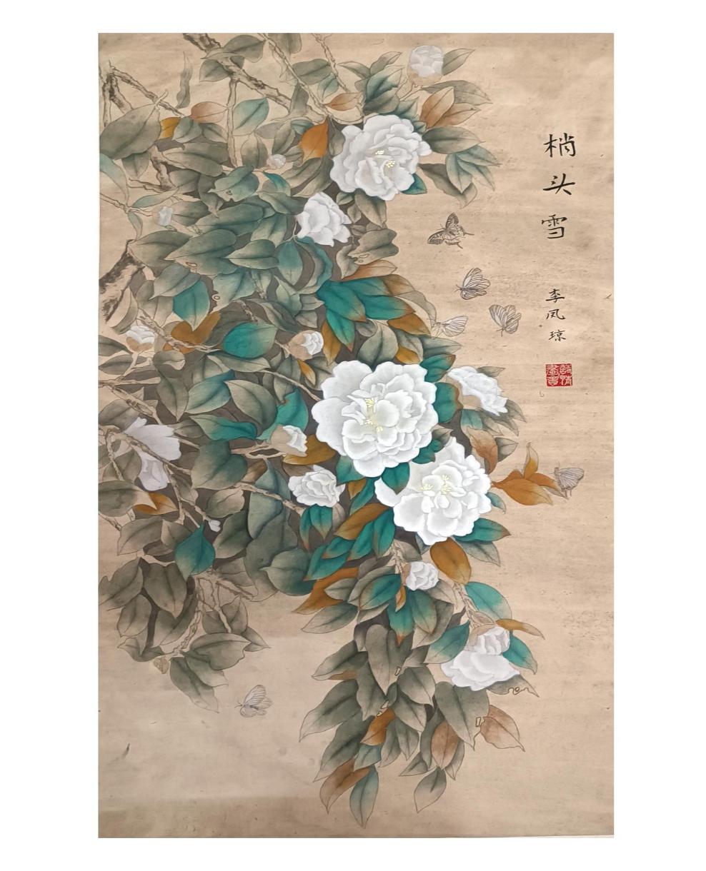画面特点:整体采灰调,背景刷以赭墨,主题采用类似重彩的画法来突出花朵与叶片,几种颜色相互映衬展现现代人的审美。画面运用分染,罩染,立粉等技法进行绘画。作品主要以白茶花为主题,周围蝴蝶环绕,叶片丰富茂盛,展现了一种生机与生命之美,白茶花寓意着美德,在冬天绽放,不与百花争艳,保持着谦卑的姿态,而作品梢头雪所表达的正是保持谦虚,不与人争论的的态度。