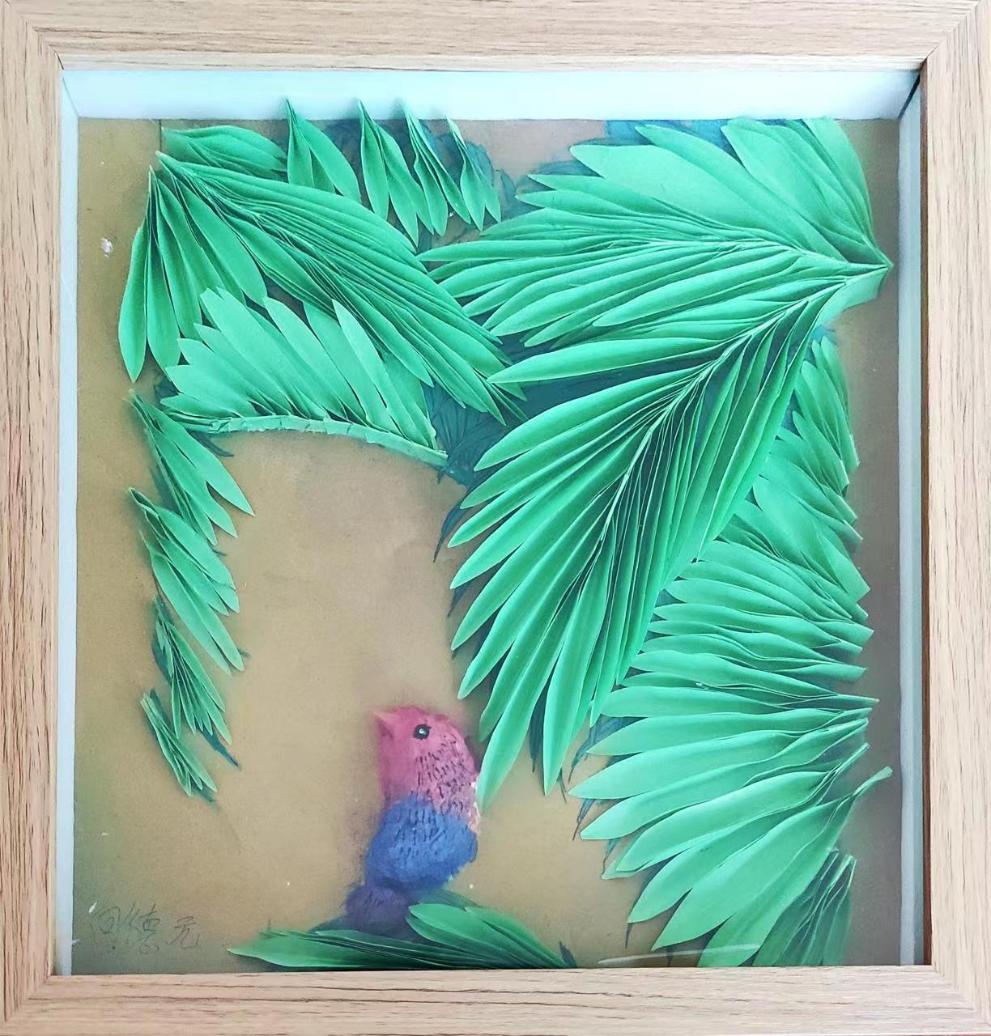 作品《夏绿》体现了现代人对家具装饰画的审美新特点————综合立体材料,以及强烈的色彩冲击,同时,也完全展示出了该生绘画、手工技能水平和理解能力。其作品的创新性在于根据指导教师的建议调整了色彩,制作出独特的装饰画作品。