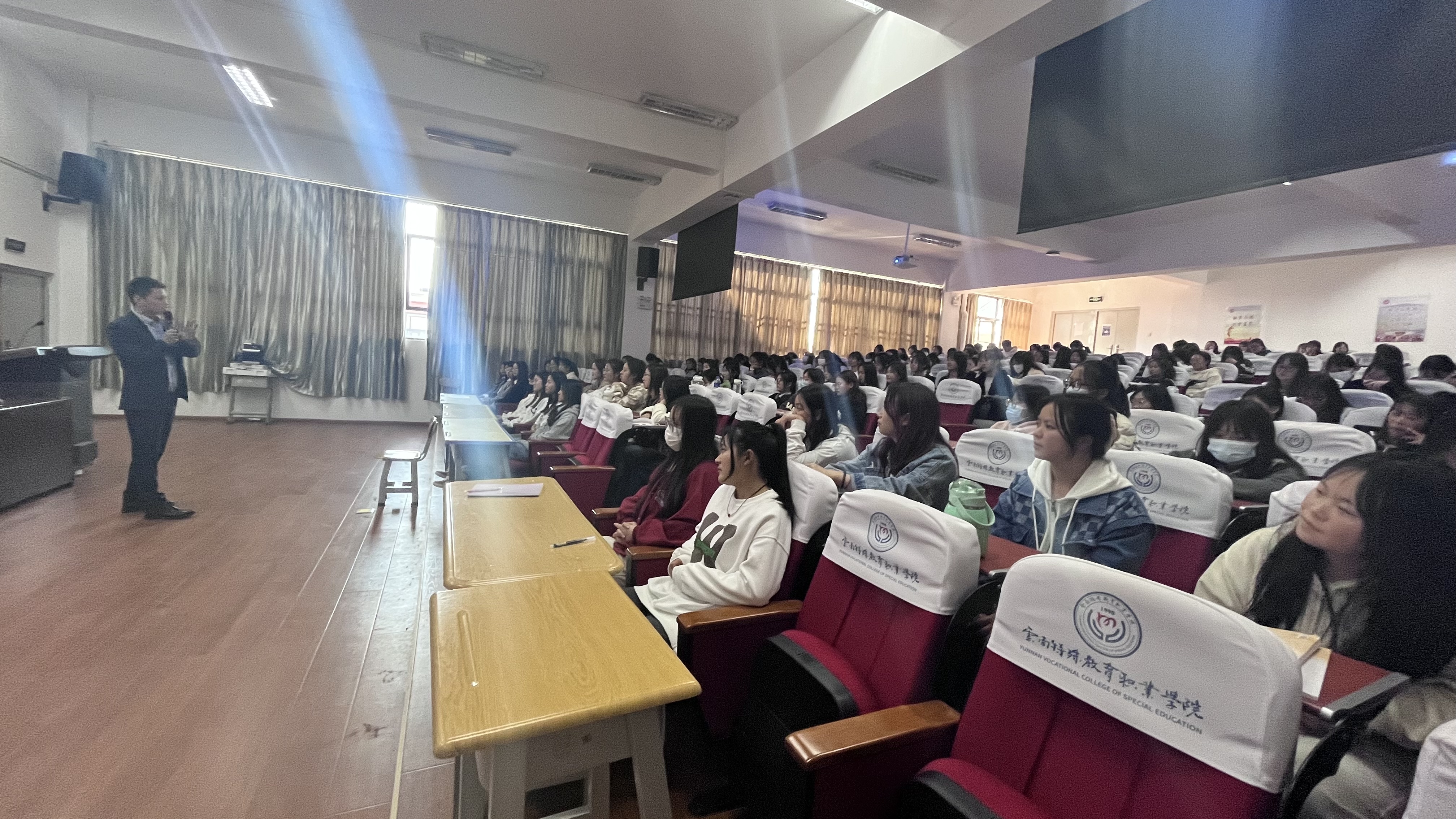 3 月 8 日下午 ,玉璋楼 408 教室座无虚席,170 名美容美体艺术专业的学生倾耳拭目,静博士人力资源部董俊老师为全体学生带来了企业文化、 校企生岗位职责、晋升渠道、入职待遇及录取要求等内容的详细讲解;而后,由我系优秀实习生代表叶云 (T20 美容美体艺术1班) 结合亲身经历给学弟学妹分享了实习生到岗后的培训内容、课程安排、起居作息、门店职责、工作内容等,引发了同学们的热烈咨询和讨论。本次宣讲从不同层面、不同视角展开,企业教师的引导让学生对企业有了系统了解,学姐的亲口讲述让学生对岗位充满体验感。